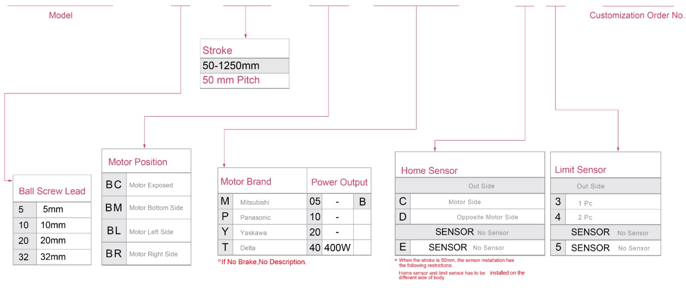 | Использовать там, где | Режим движения | Технические характеристики модели | Выход двигателя (в) | Ширина (мм) | Повторяемость (мм) | Технические характеристики шарикового винта | Максимальная полезная нагрузка (кг) | Максимальная скорость (мм/с) *1 | ||