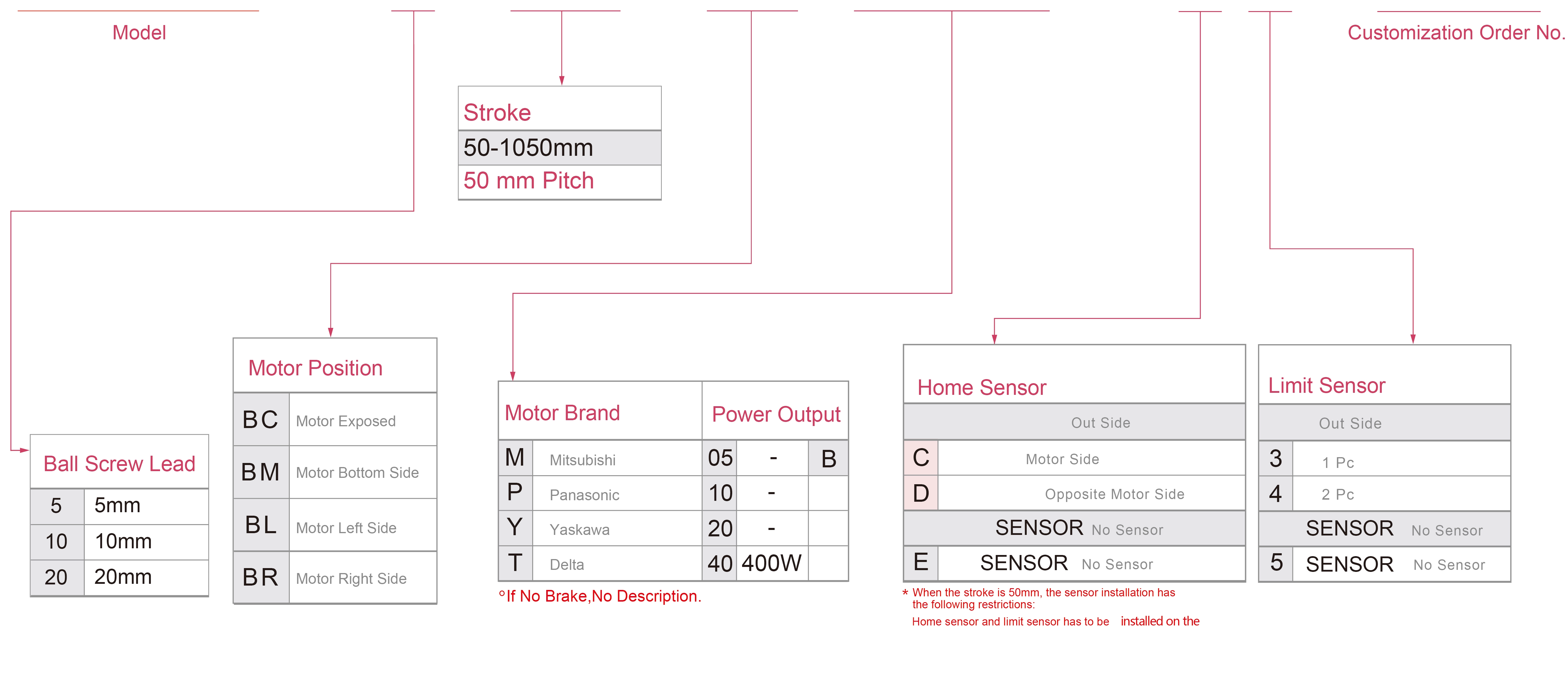 | Использовать там, где | Режим движения | Технические характеристики модели | Выход двигателя (в) | Ширина (мм) | Повторяемость (мм) | Технические характеристики шарикового винта | Максимальная полезная нагрузка (кг) | Максимальная скорость (мм/с) *1 | ||