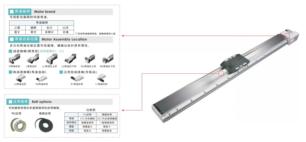 | Использовать там, где | Режим движения | Технические характеристики модели | Редукционный механизм | Выход двигателя (в) | Ширина (мм) | Повторяемость (мм) | Технические характеристики ремня | Максимальная полезная нагрузка (кг) | Максимальная скорость (мм/с) *1 | ||