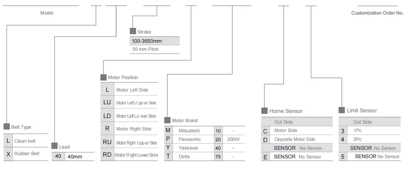 | Использовать там, где | Режим движения | Технические характеристики модели | Редукционный механизм | Выход двигателя (в) | Ширина (мм) | Рост тела (мм) | Повторяемость (мм) | Технические характеристики ремня | Максимальная полезная нагрузка (кг) | Максимальная скорость (мм/с) *1 | ||