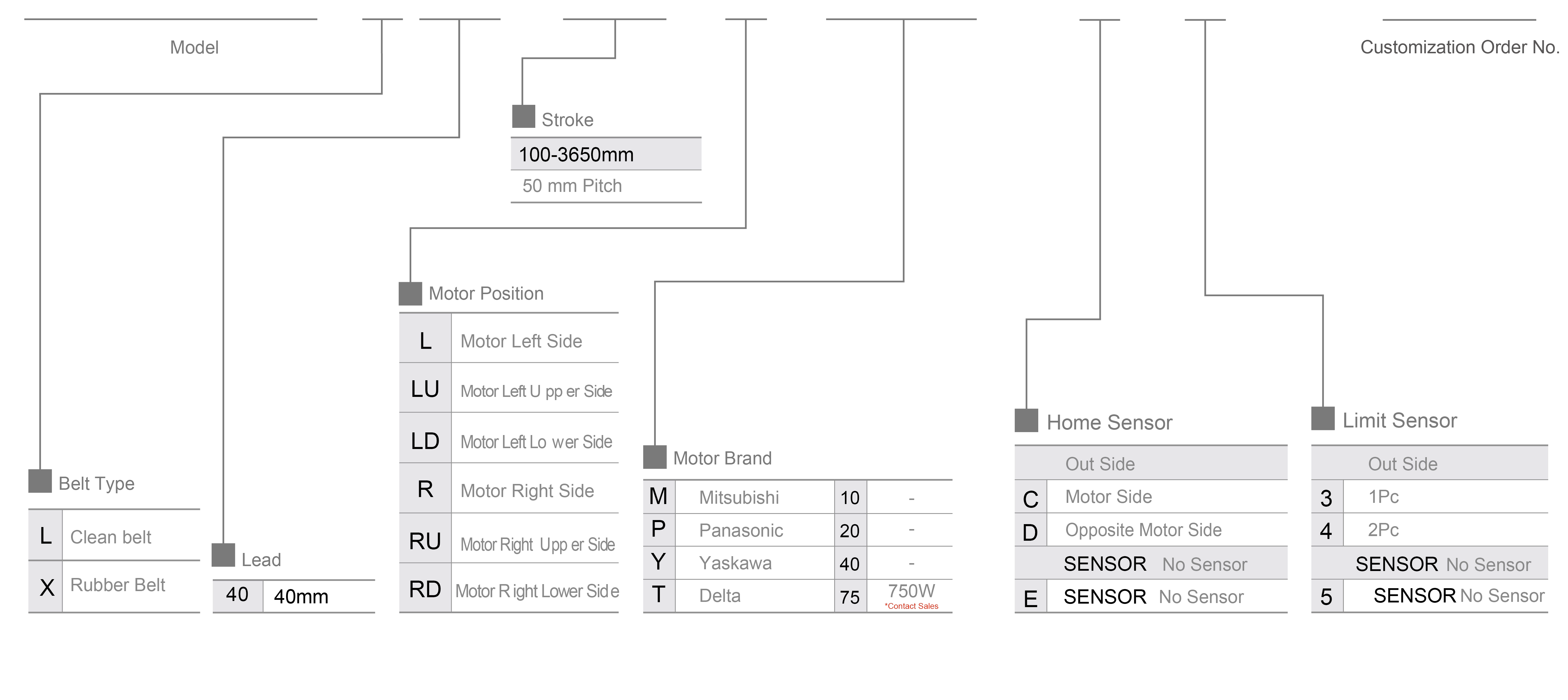 | Использовать там, где | Режим движения | Технические характеристики модели | Редукционный механизм | Выход двигателя (в) | Ширина (мм) | Рост тела (мм) | Повторяемость (мм) | Технические характеристики ремня | Максимальная полезная нагрузка (кг) | Максимальная скорость (мм/с) *1 | ||