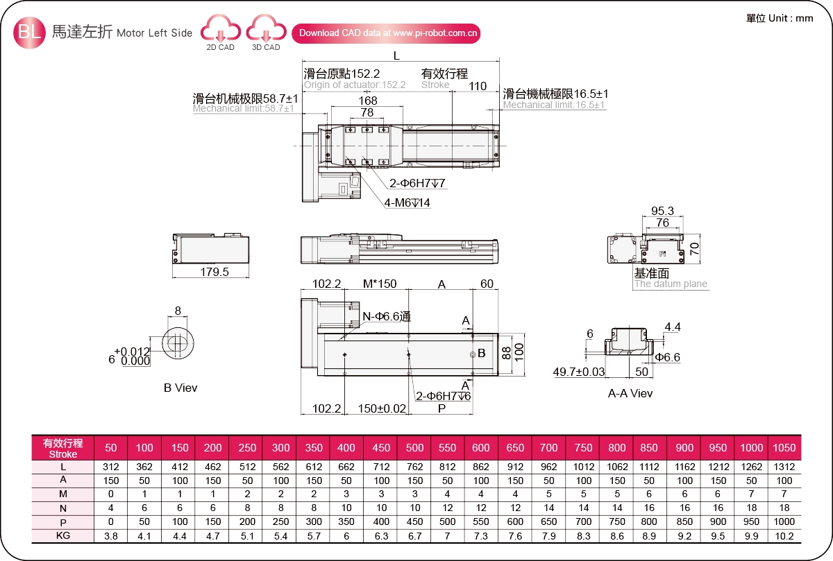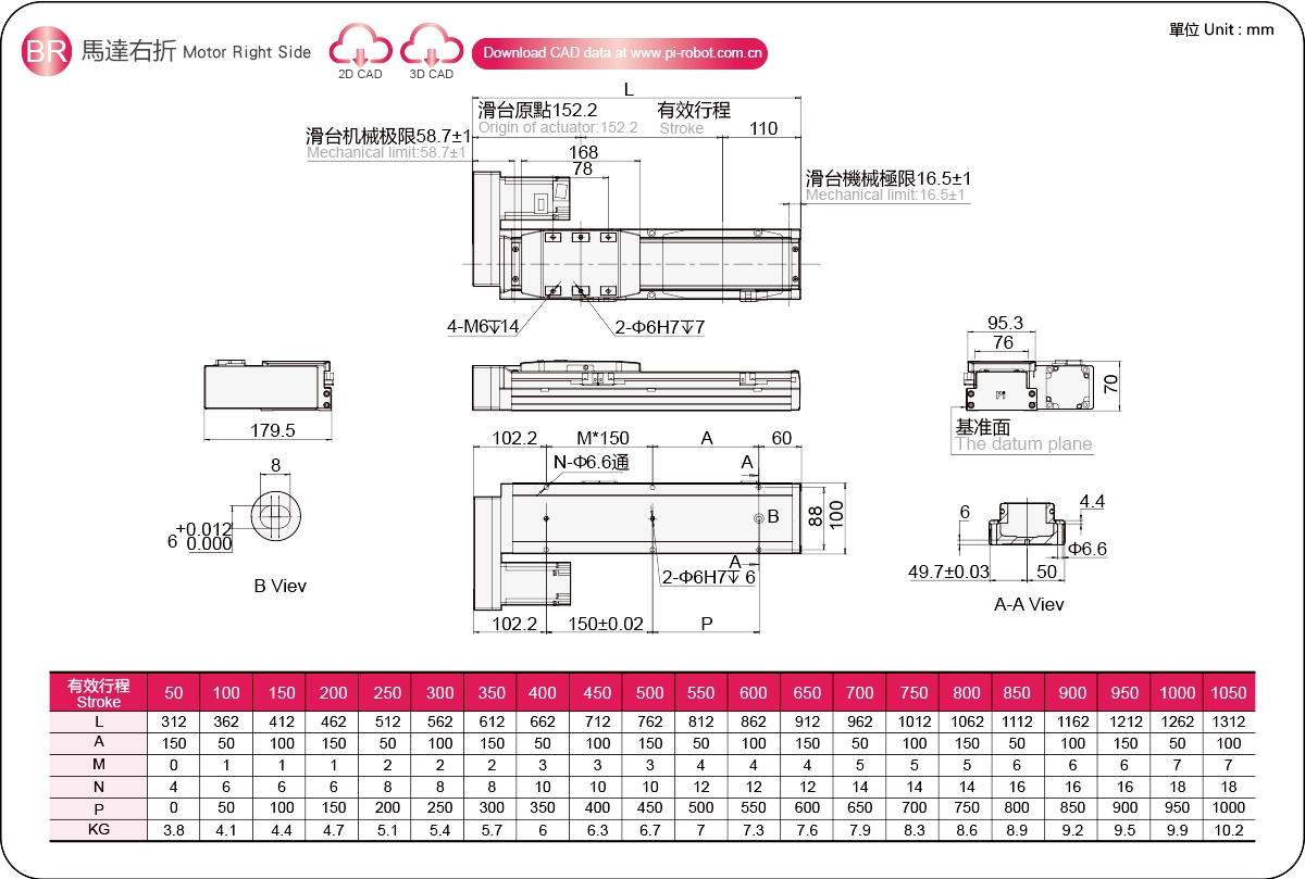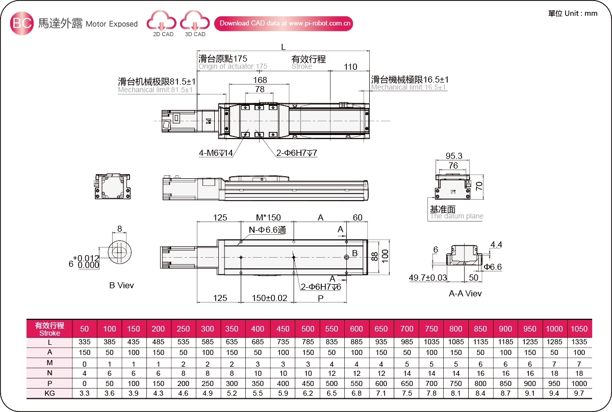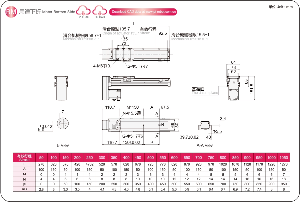 Диапазон перемещения: 50-1050 мм