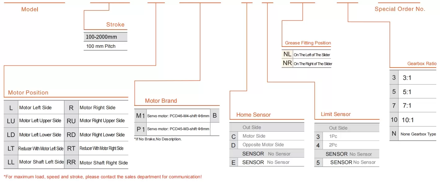 | Использовать там, где | Режим движения | Технические характеристики модели | Редукционный механизм | Выход двигателя (в) | Ширина (мм) | Повторяемость (мм) | Технические характеристики ремня | Максимальная полезная нагрузка (кг) | Максимальная скорость (мм/с) *1 | ||