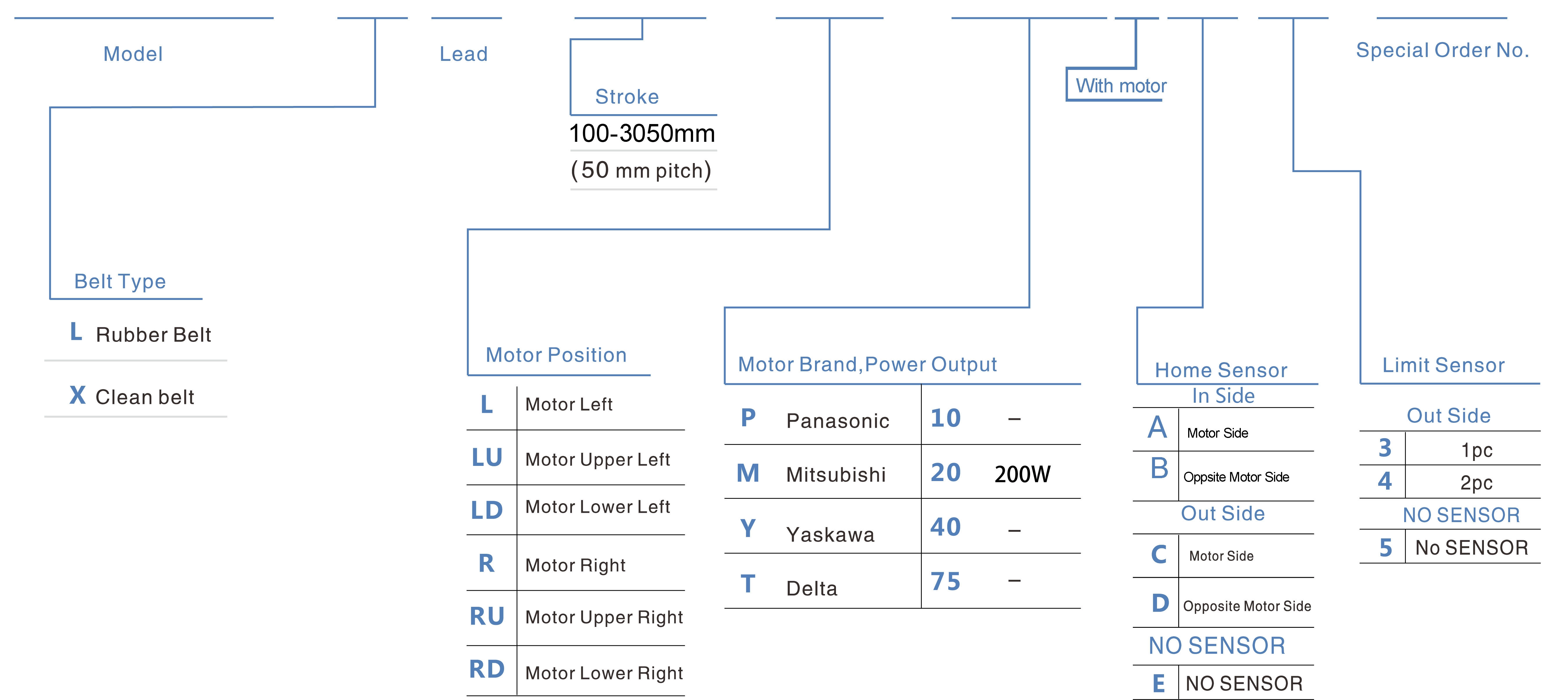 | Использовать там, где | Режим движения | Технические характеристики модели | Редукционный механизм | Выход двигателя (в) | Ширина (мм) | Повторяемость (мм) | Технические характеристики ремня | Максимальная полезная нагрузка (кг) | Максимальная скорость (мм/с) *1 | ||