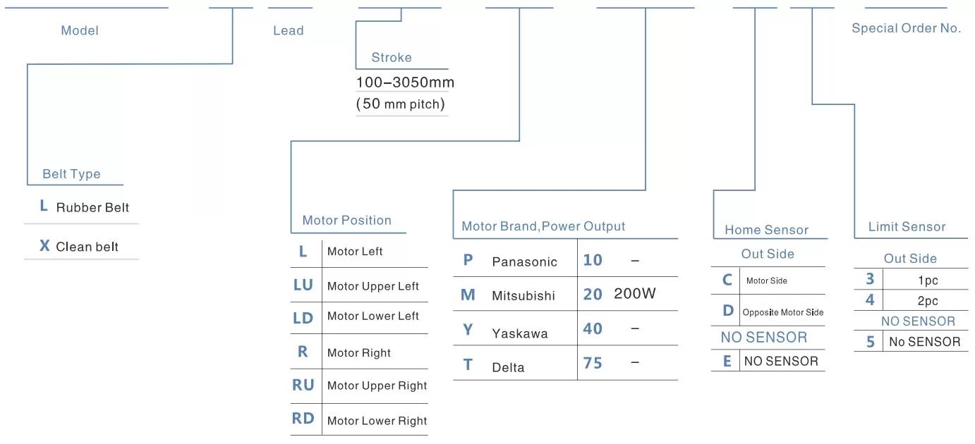 | Использовать там, где | Режим движения | Технические характеристики модели | Редукционный механизм | Выход двигателя (в) | Ширина (мм) | Повторяемость (мм) | Технические характеристики ремня | Максимальная полезная нагрузка (кг) | Максимальная скорость (мм/с) *1 | ||