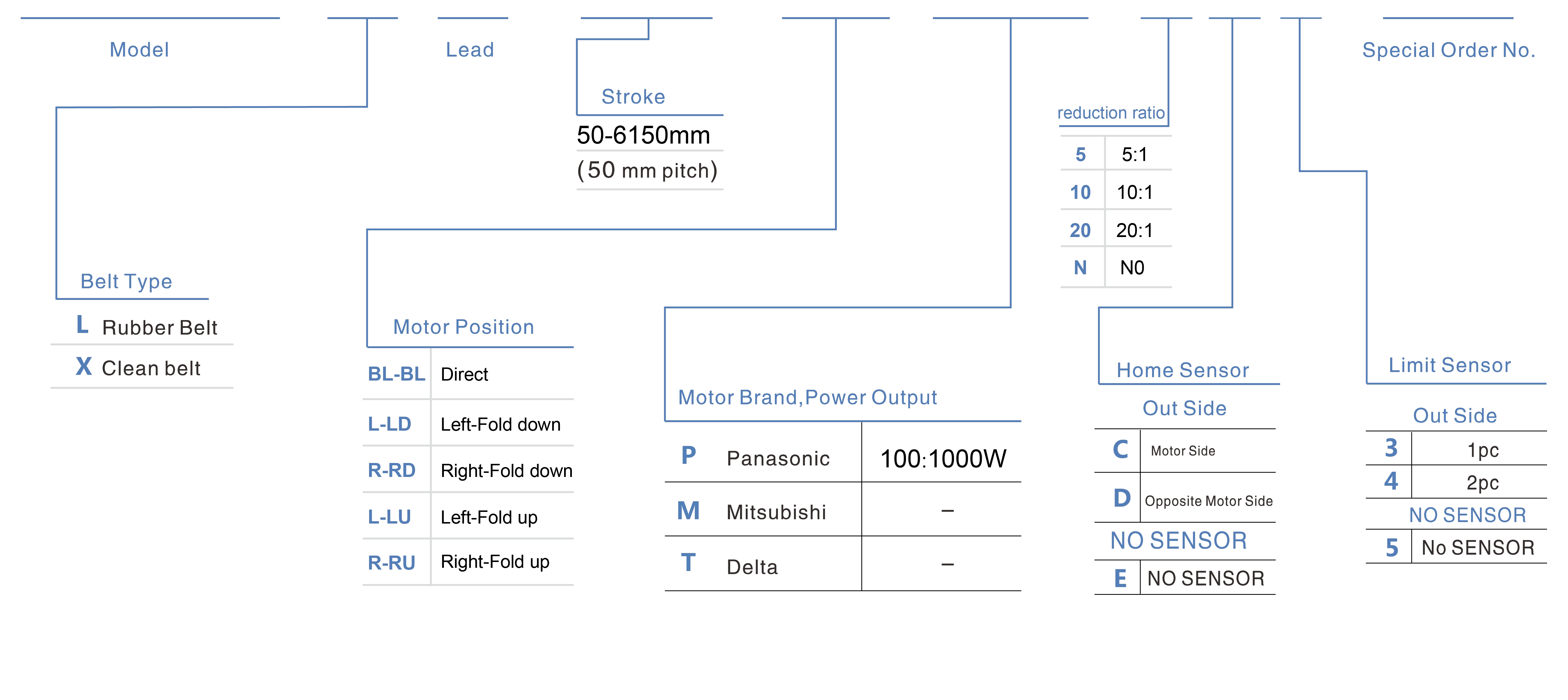 | Использовать там, где | Режим движения | Технические характеристики модели | Редукционный механизм | Выход двигателя (в) | Ширина (мм) | Повторяемость (мм) | Технические характеристики ремня | Максимальная полезная нагрузка (кг) | Максимальная скорость (мм/с) *1 | ||